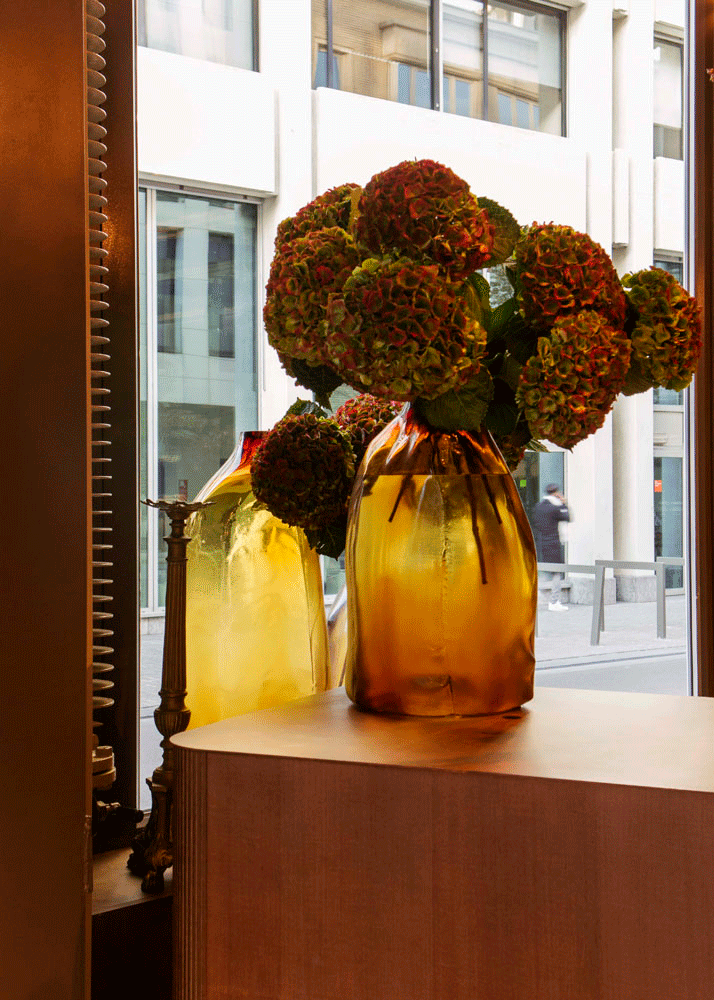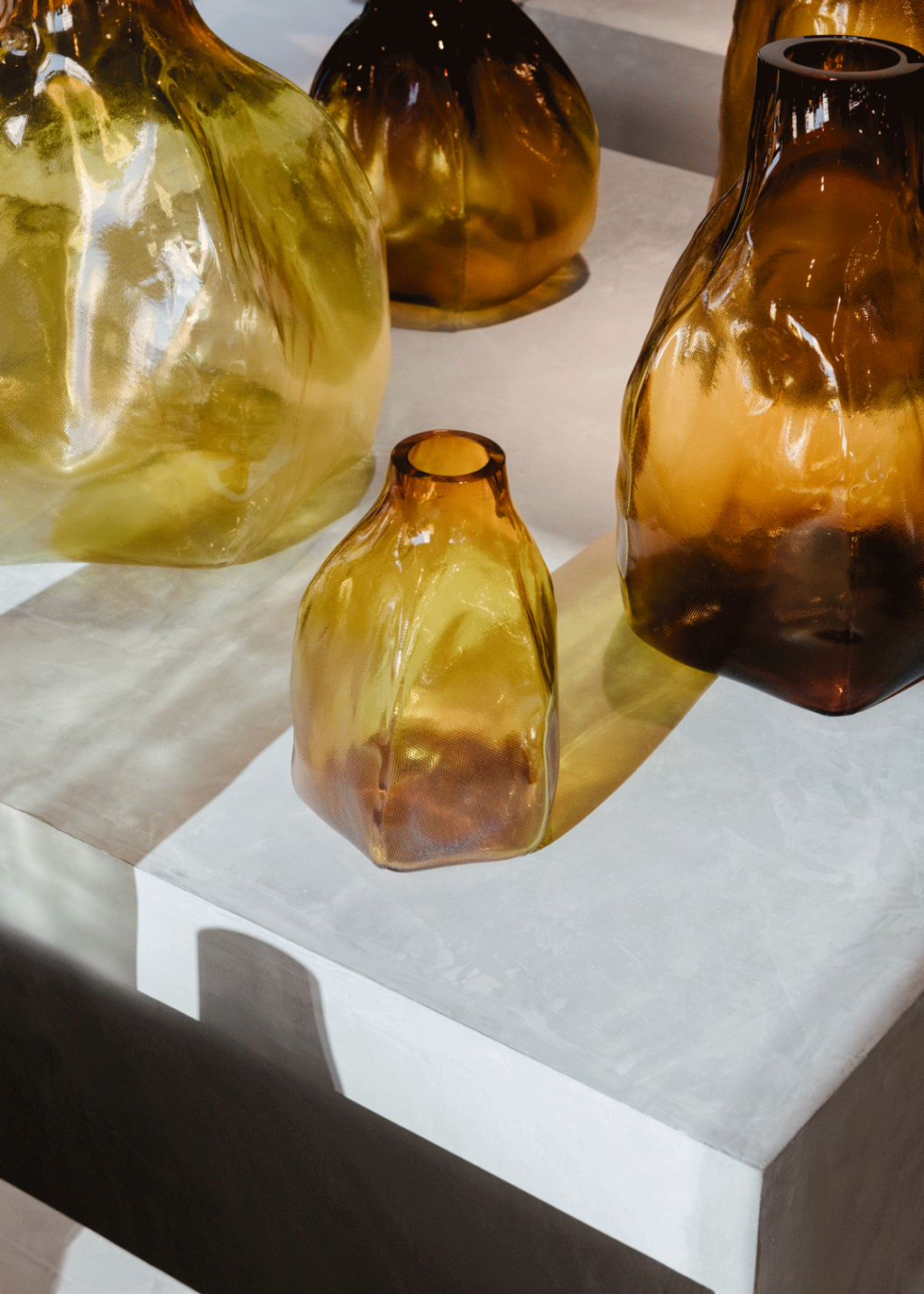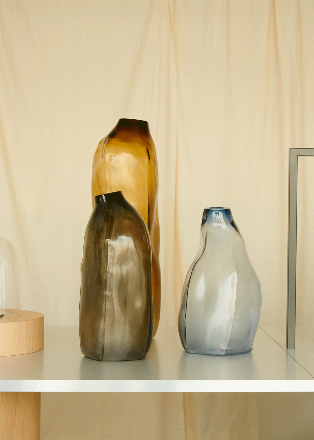 The concept of »fire-as-element« to direct the design process. Vogel wanted to show the variety of what‘s possible to achieve when making glass forms with fabric molds as well as the innovation in both shape and material, displayed as a big group of objects. The manipulation of the surface plays with the unexpected.