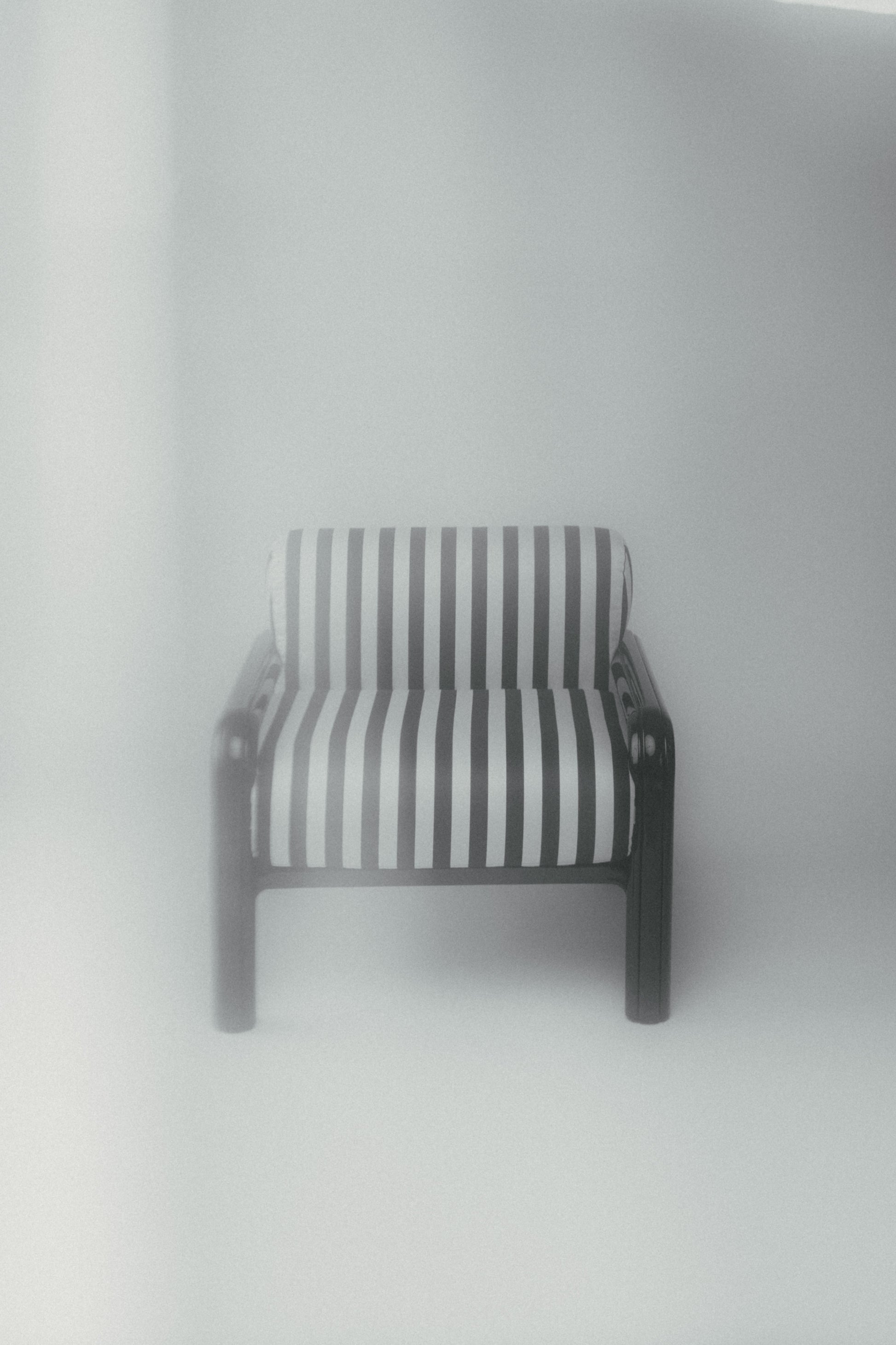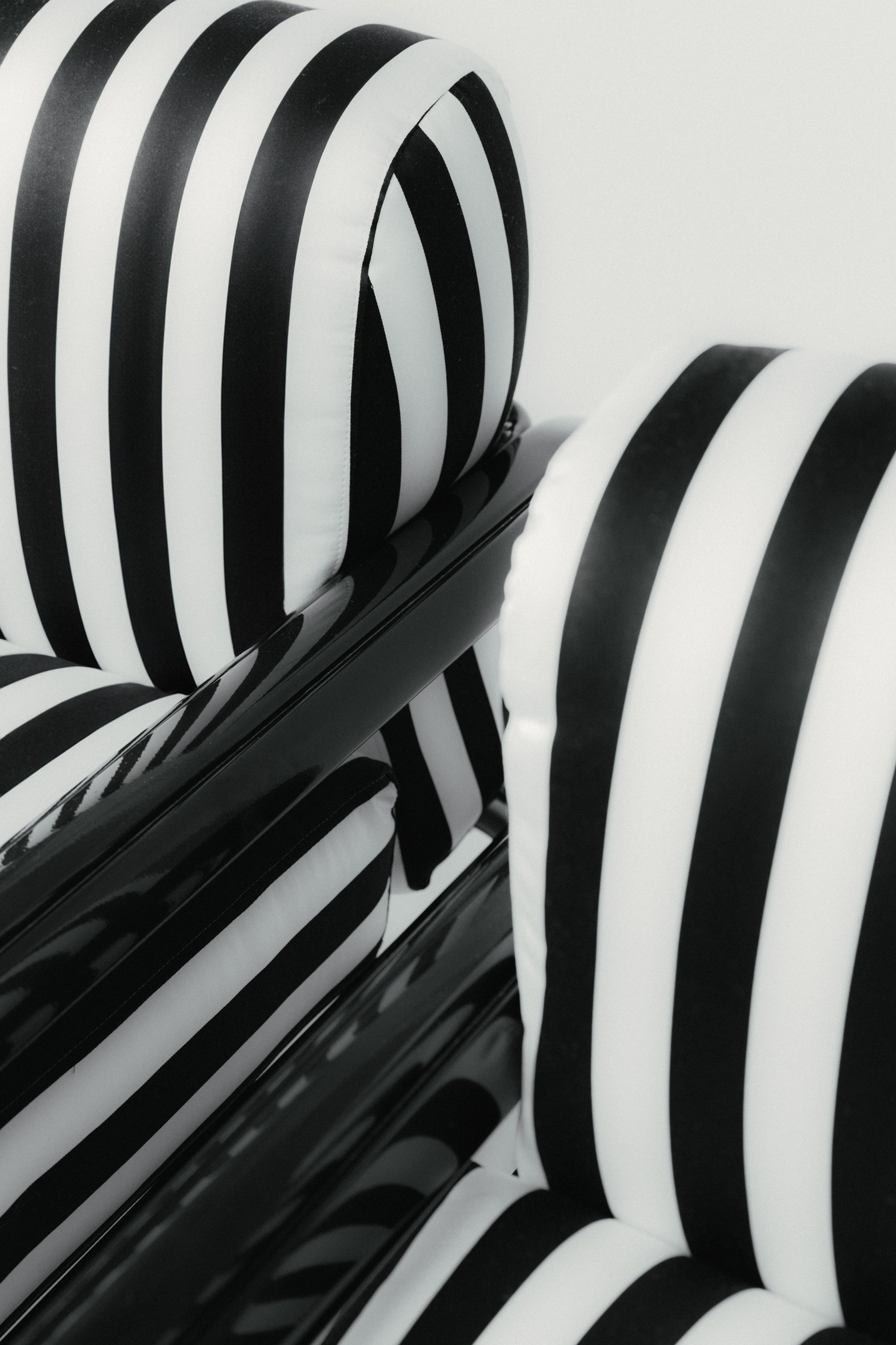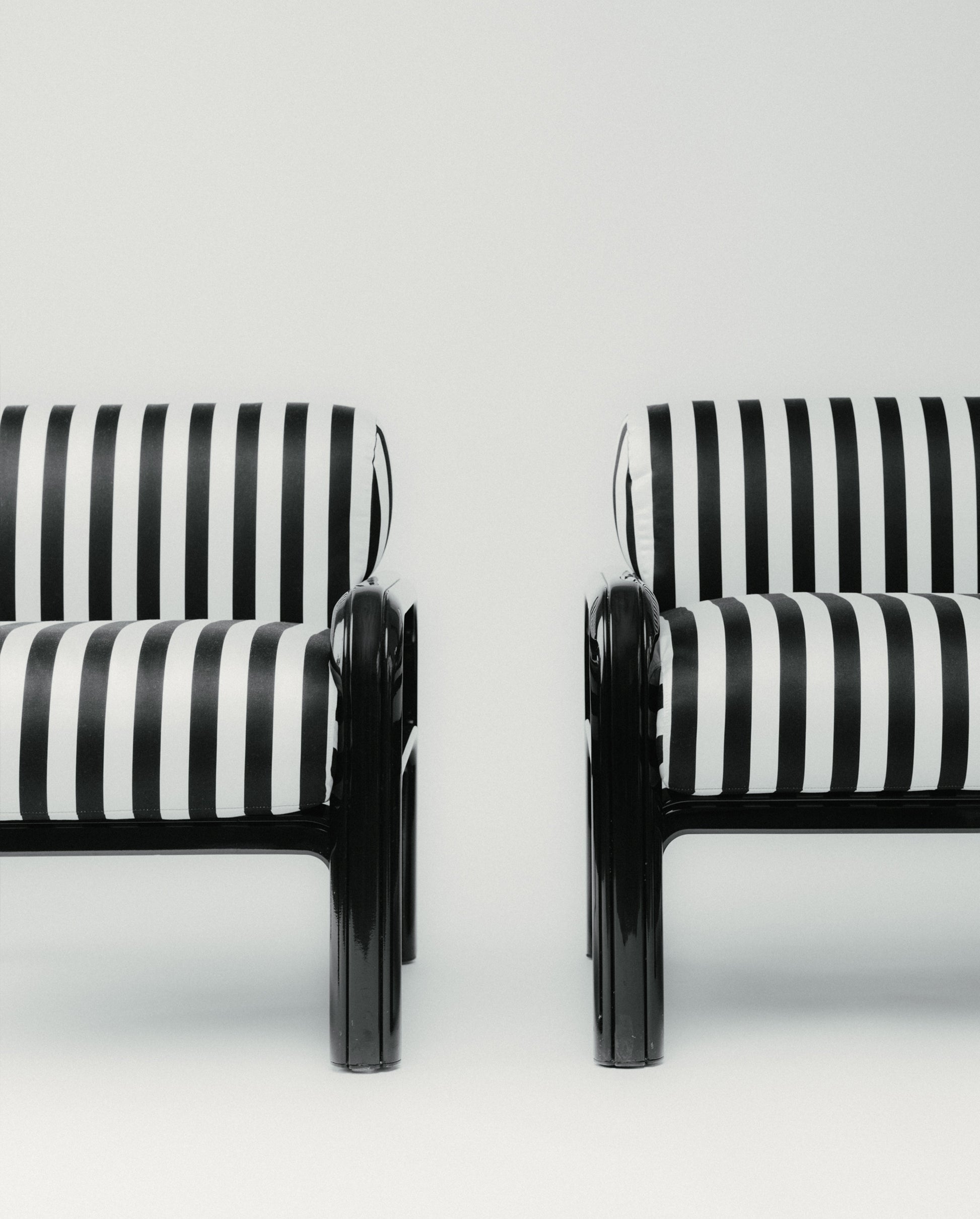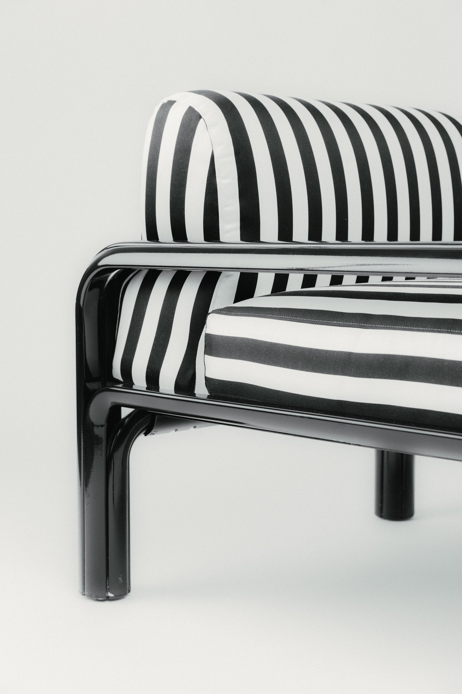 These armchairs are part of a collection designed by renowned Italian architect Gae Aulenti in the 1970s for Knoll International. Gae Aulenti famously designed Musée d’Orsay. The pair have an industrial edge paired down with groovy stripes upholstery.