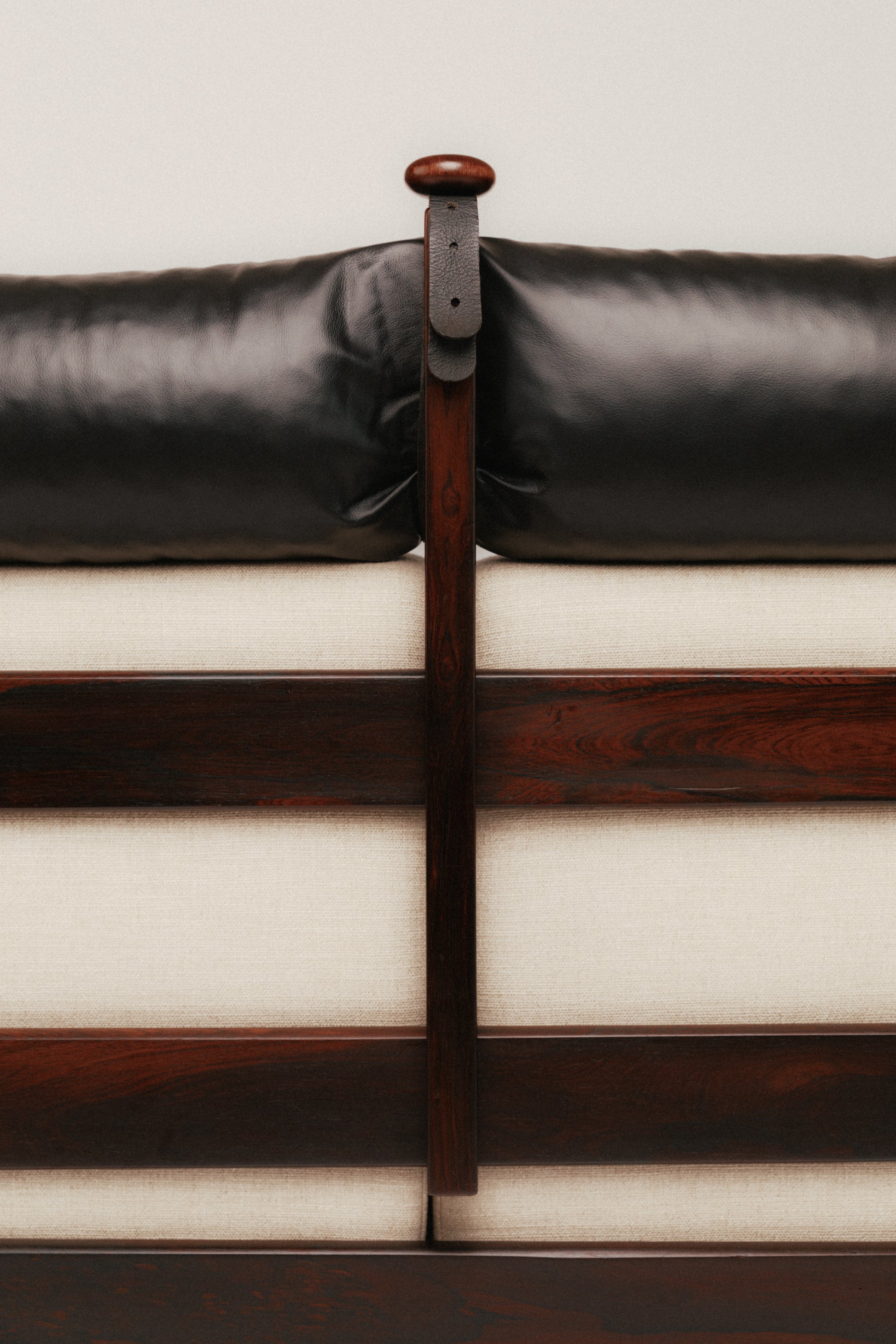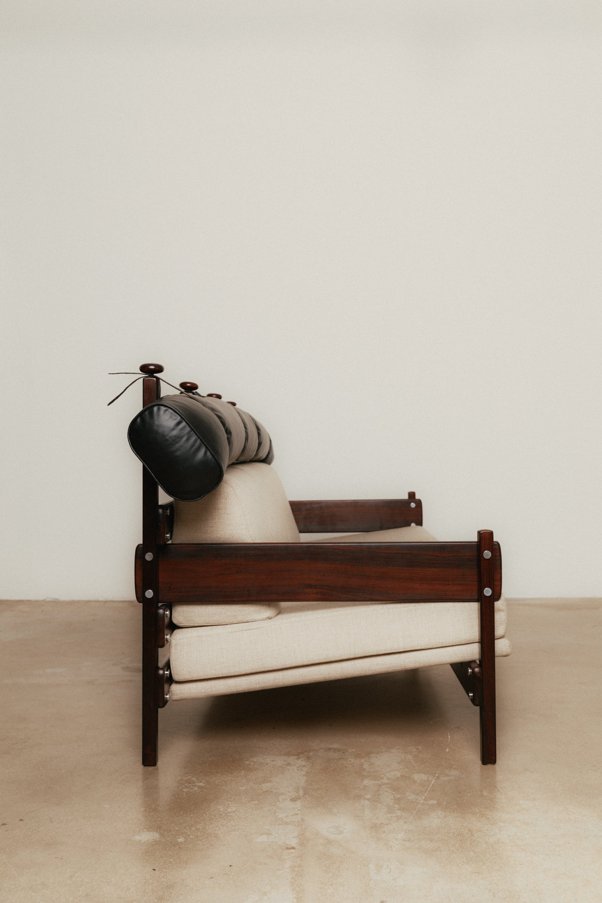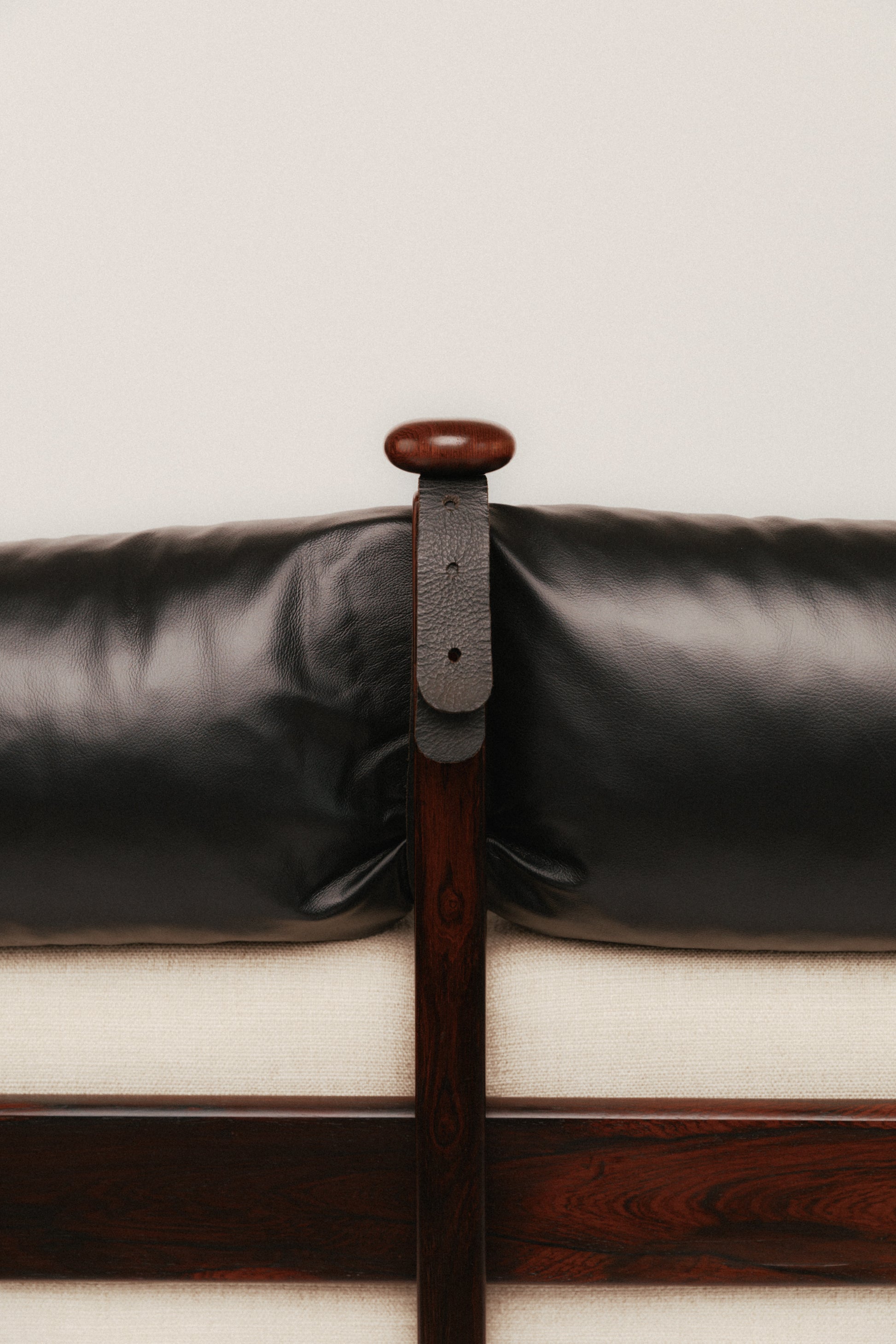 Wood frame, black leather pillow, and linen-cotton upholstery