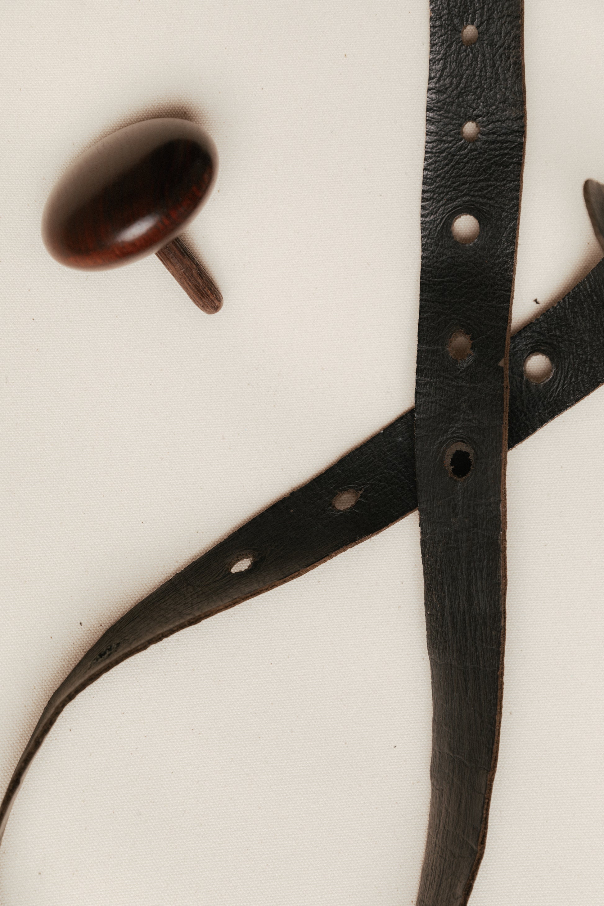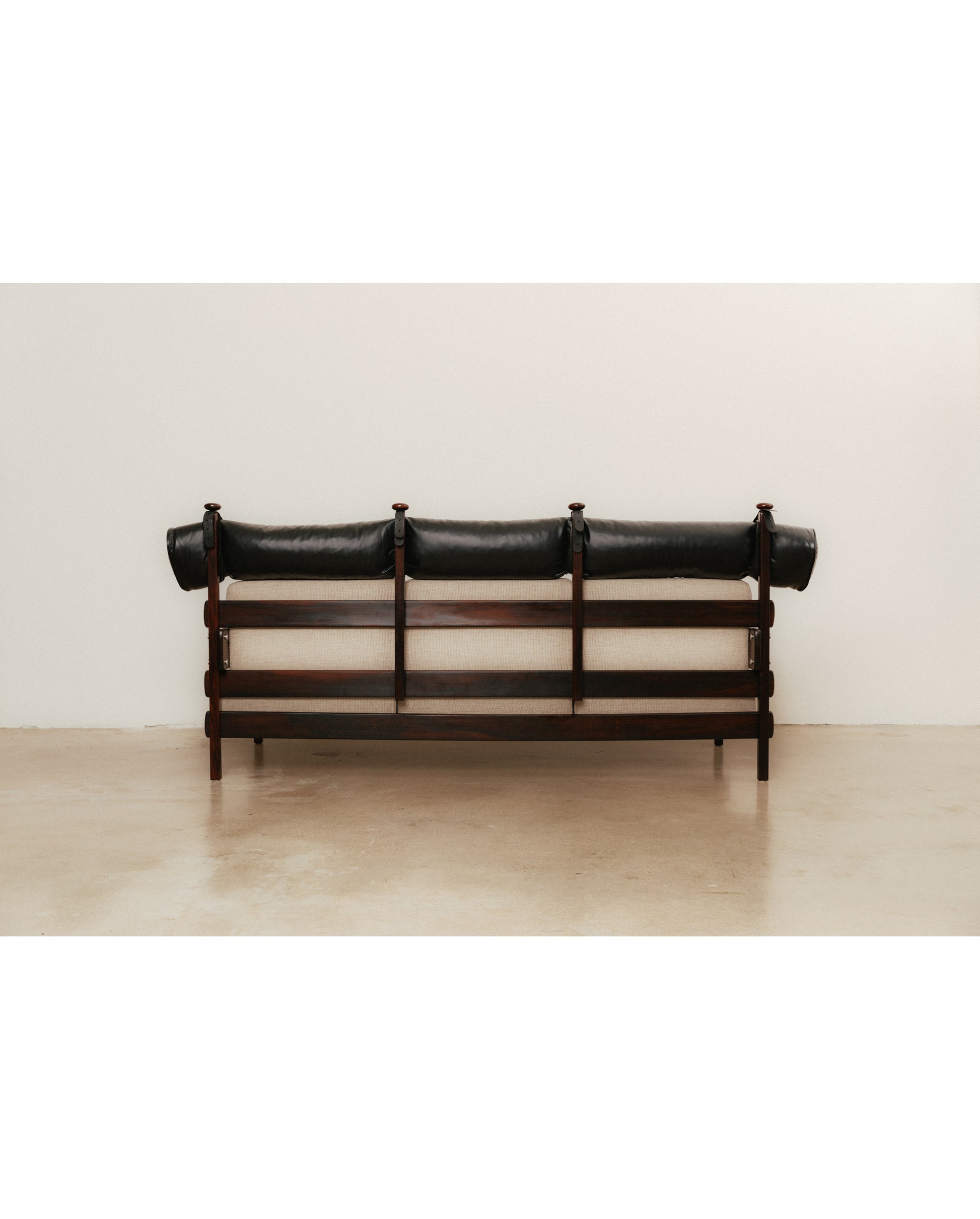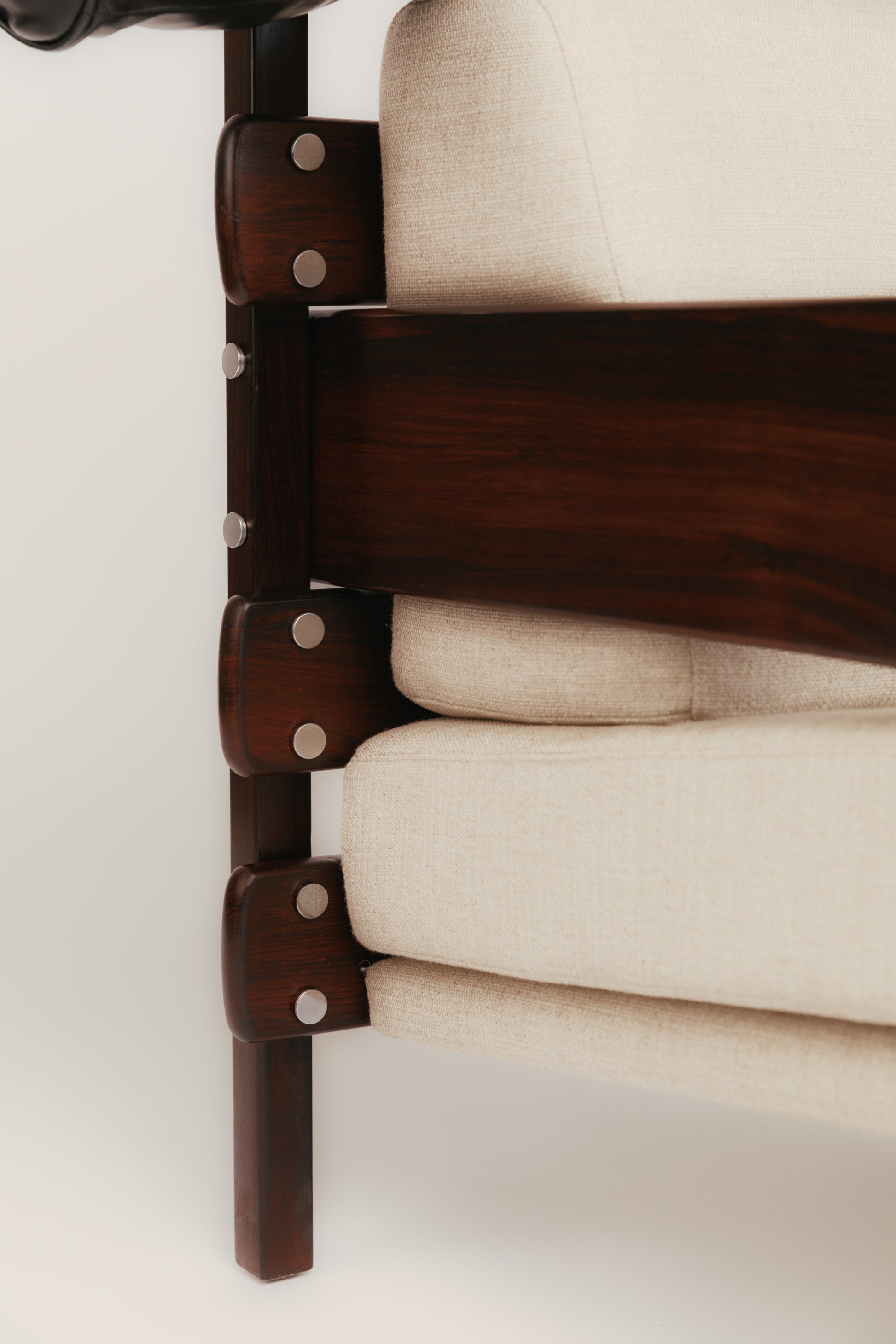 Wood frame, black leather pillow, and linen-cotton upholstery