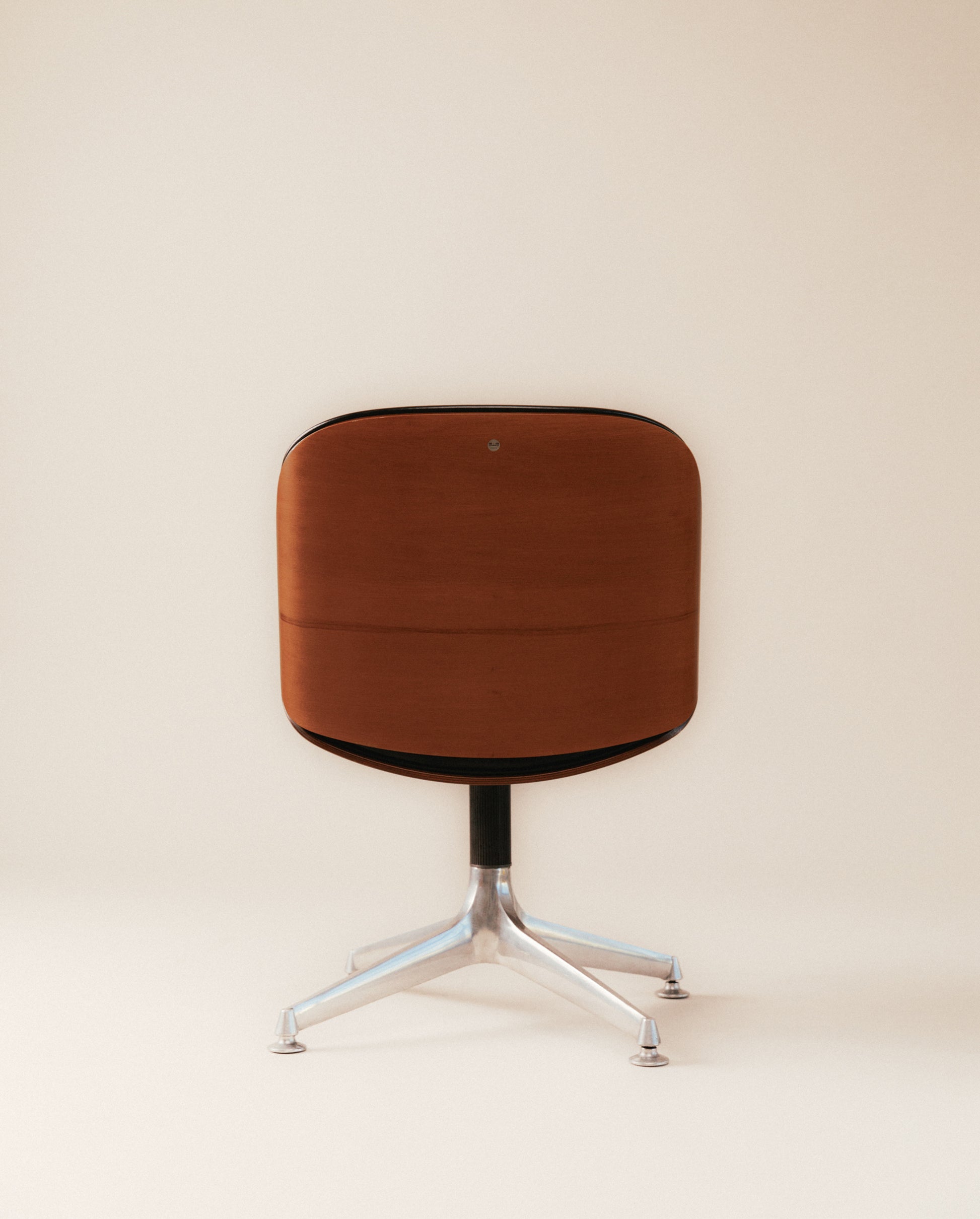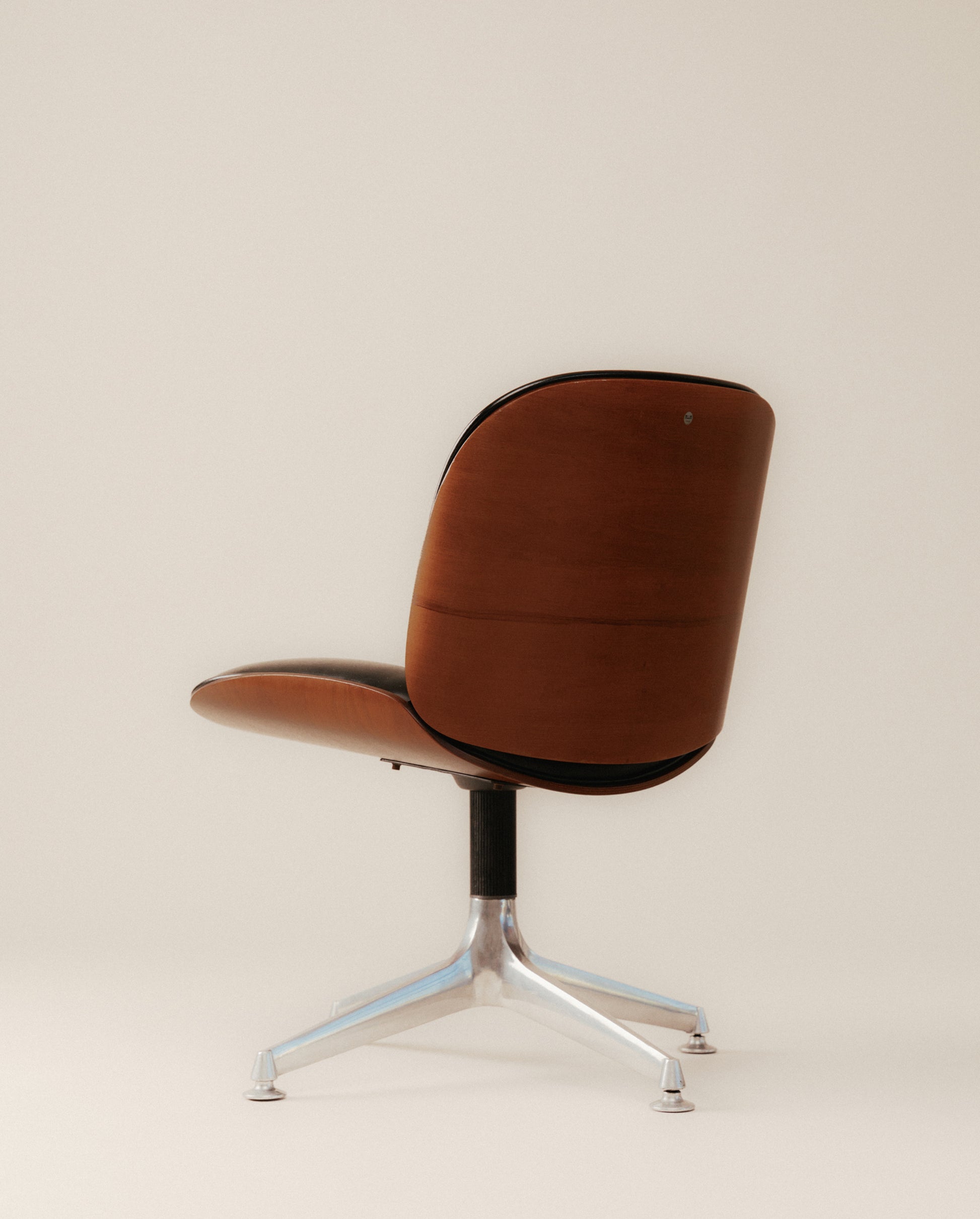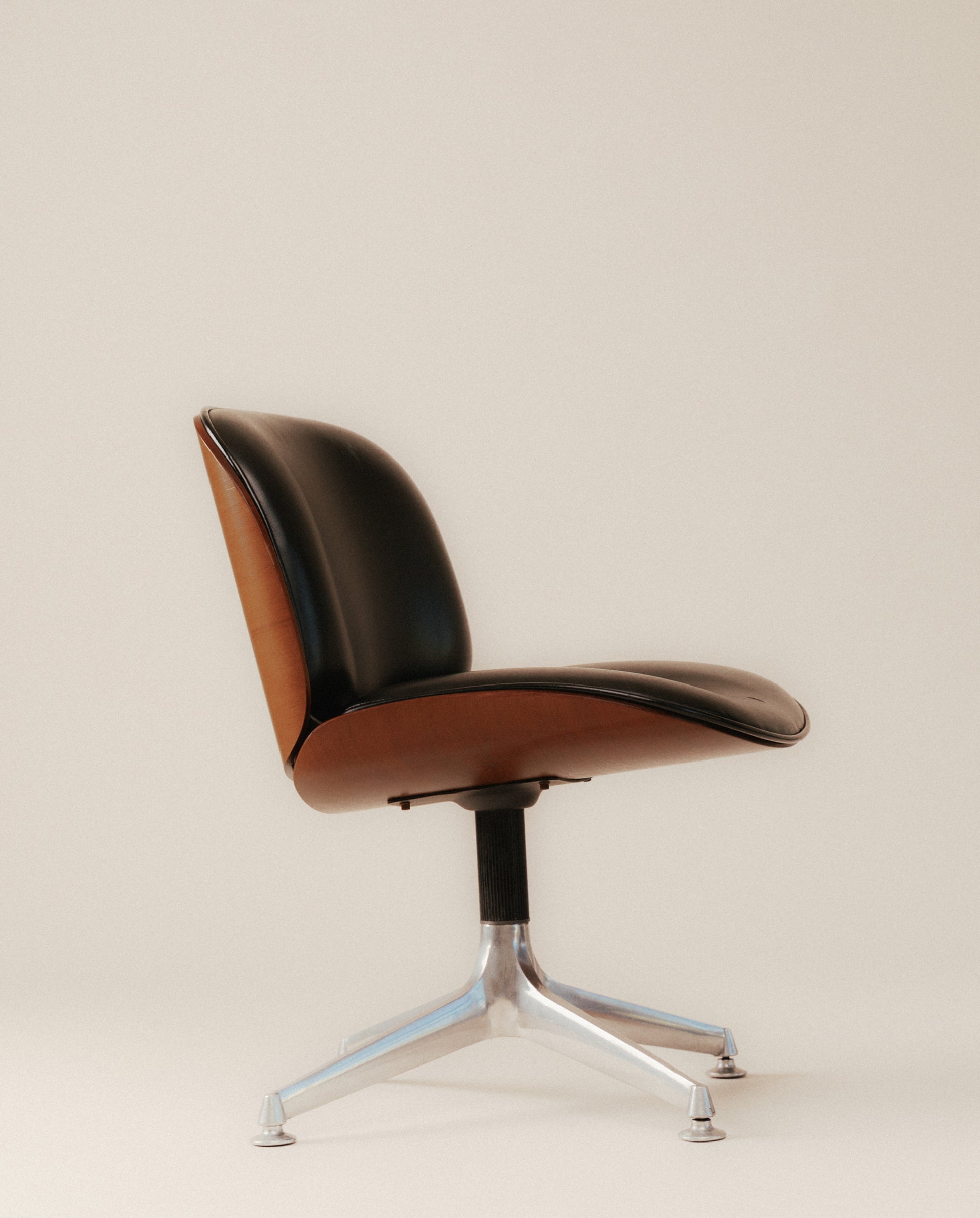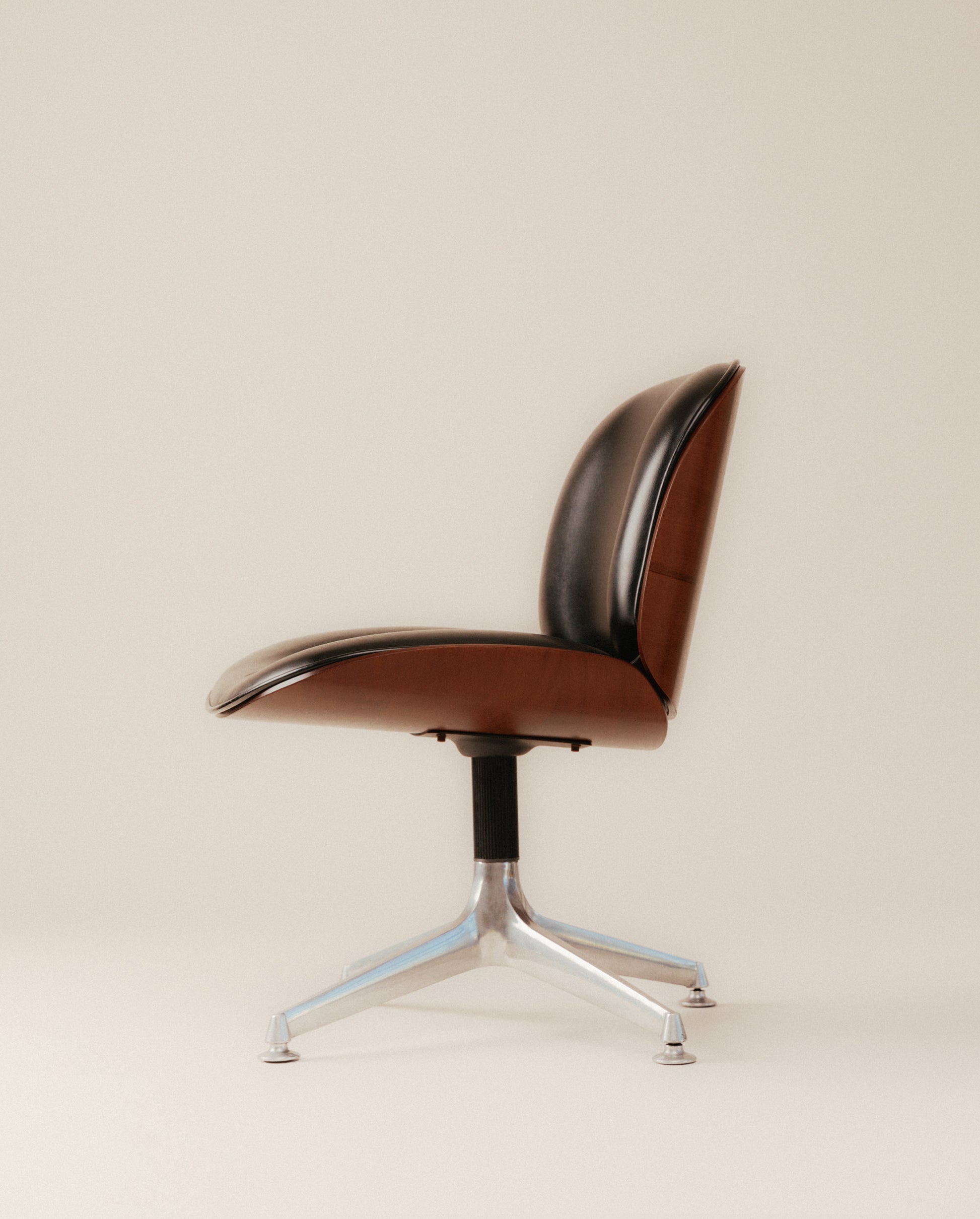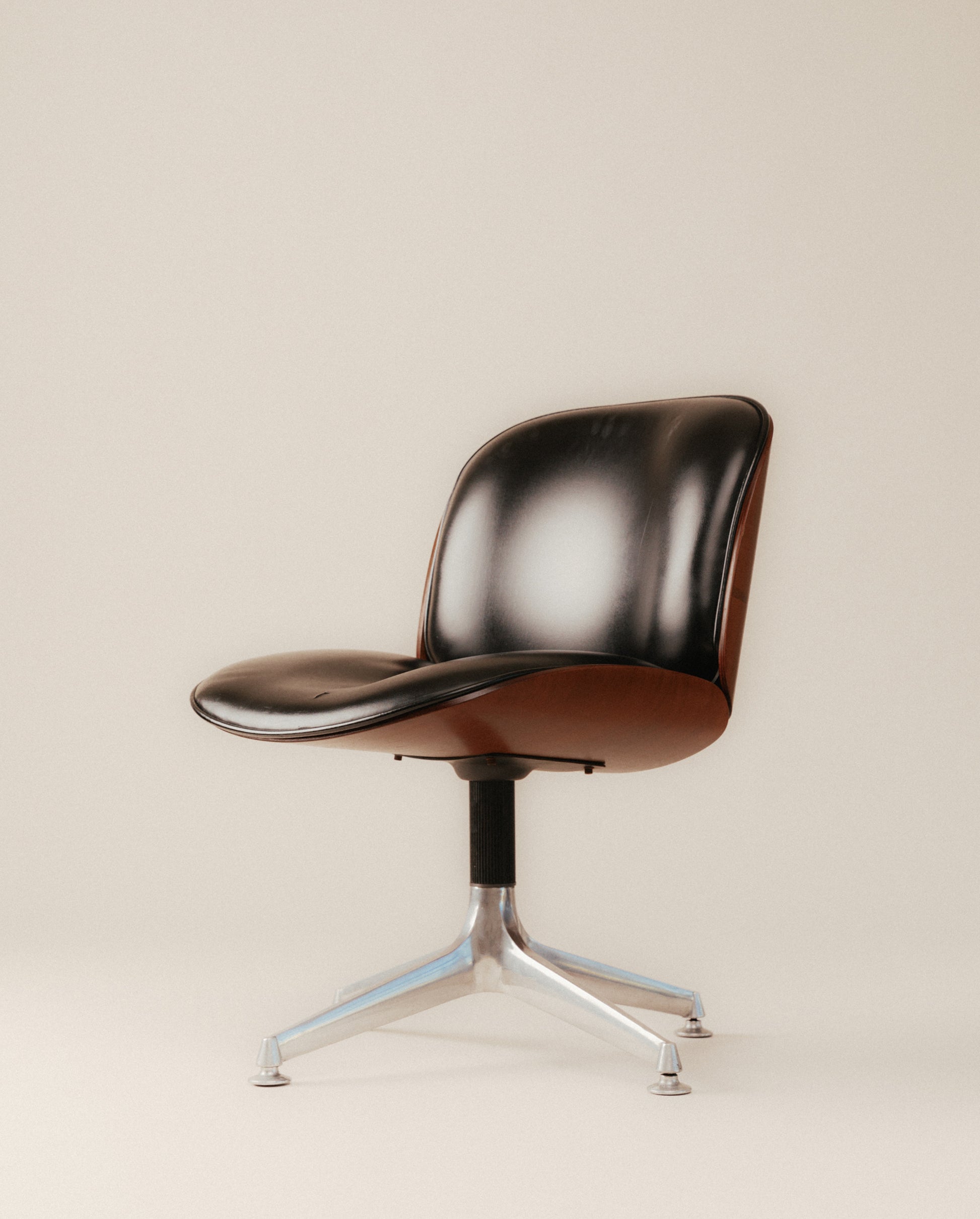 Italian midcentury swivel office chair designed by Ico Parisi for MIM. It features a five star aluminum base, a oak veneer with renewed black leather upholstery. Original manufacturers label on the back.