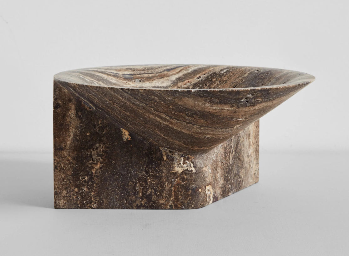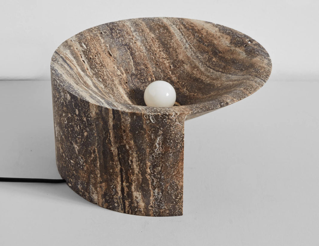 Carved from a single block of stone in Porto, Portugal, this free-standing sculptural light combines weight and balance in a design that emits a gentle, atmospheric glow. Its form creates a striking visual tension, juxtaposing its substantial heft with a sense of delicate imbalance.