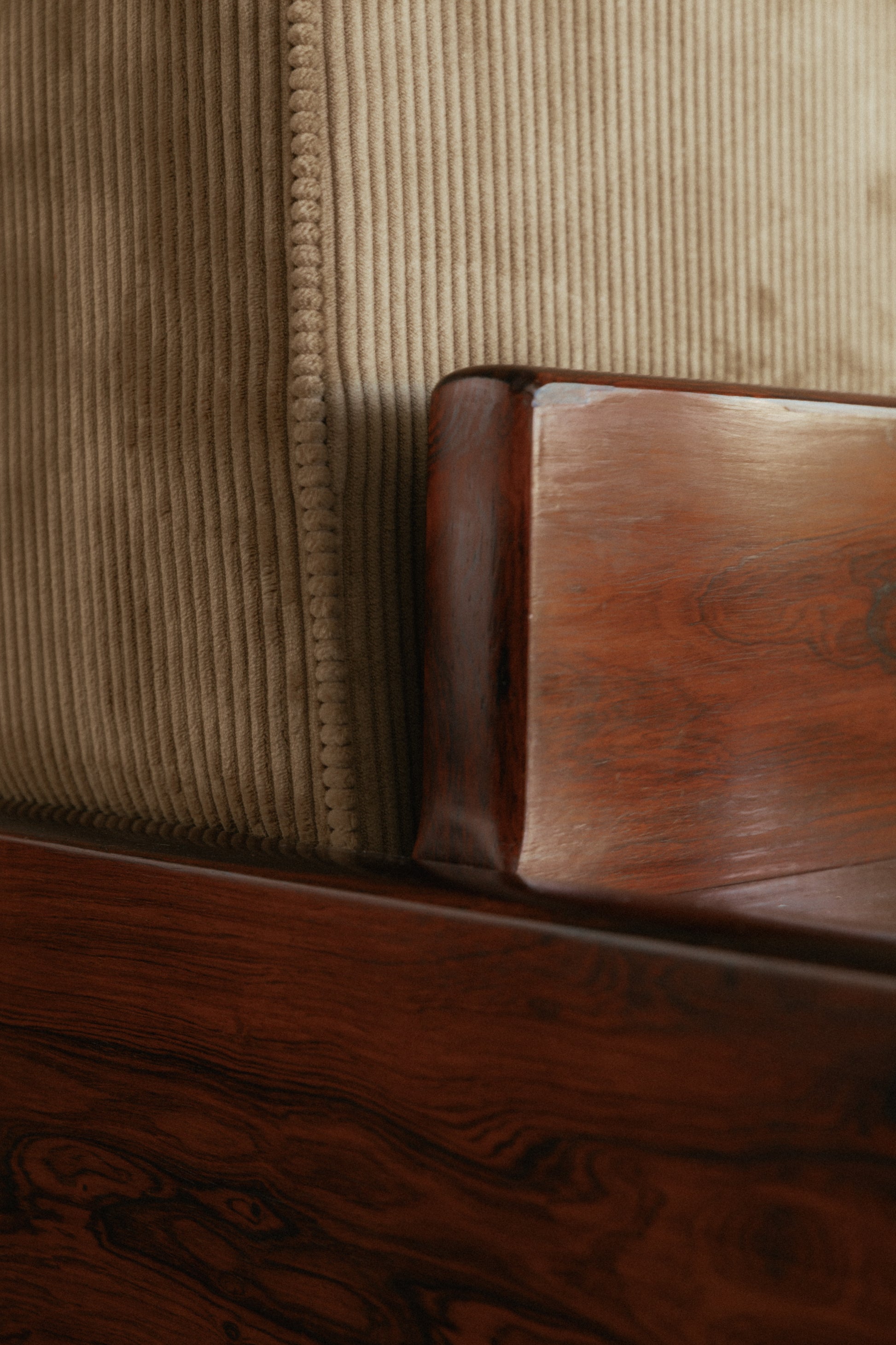 Wood frame, rosewood veneers, corduroy velvet upholstery