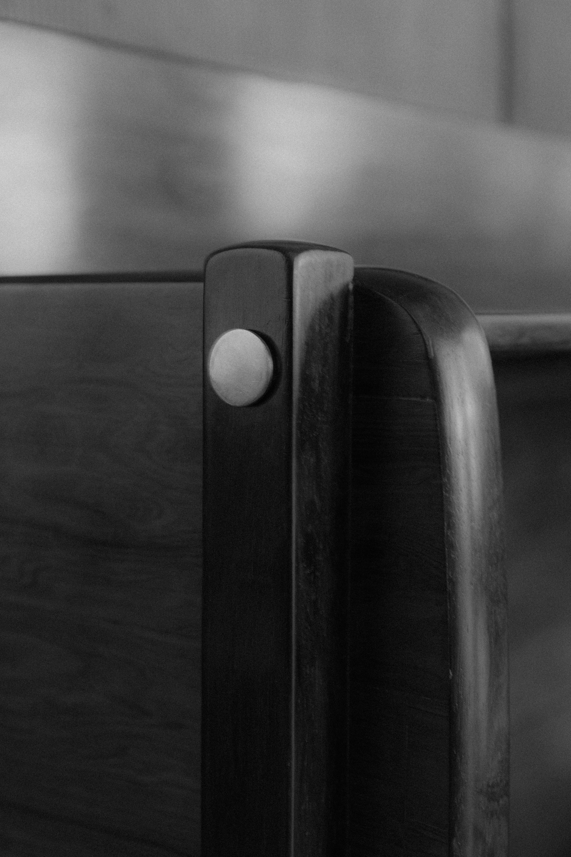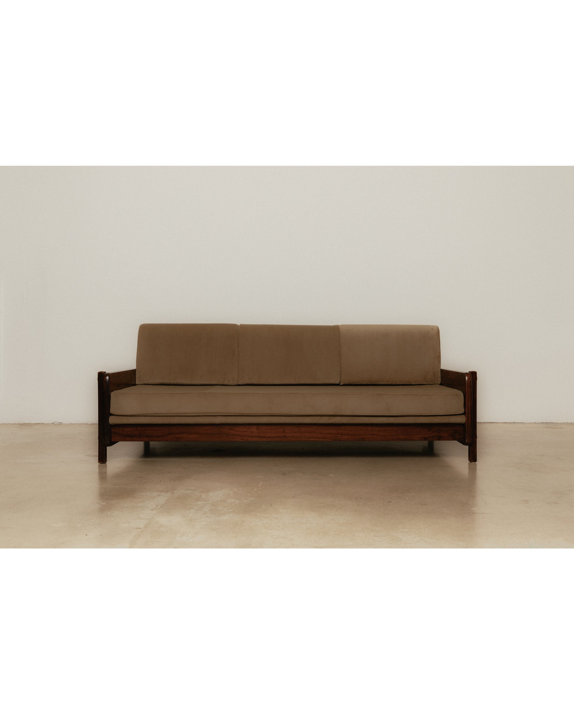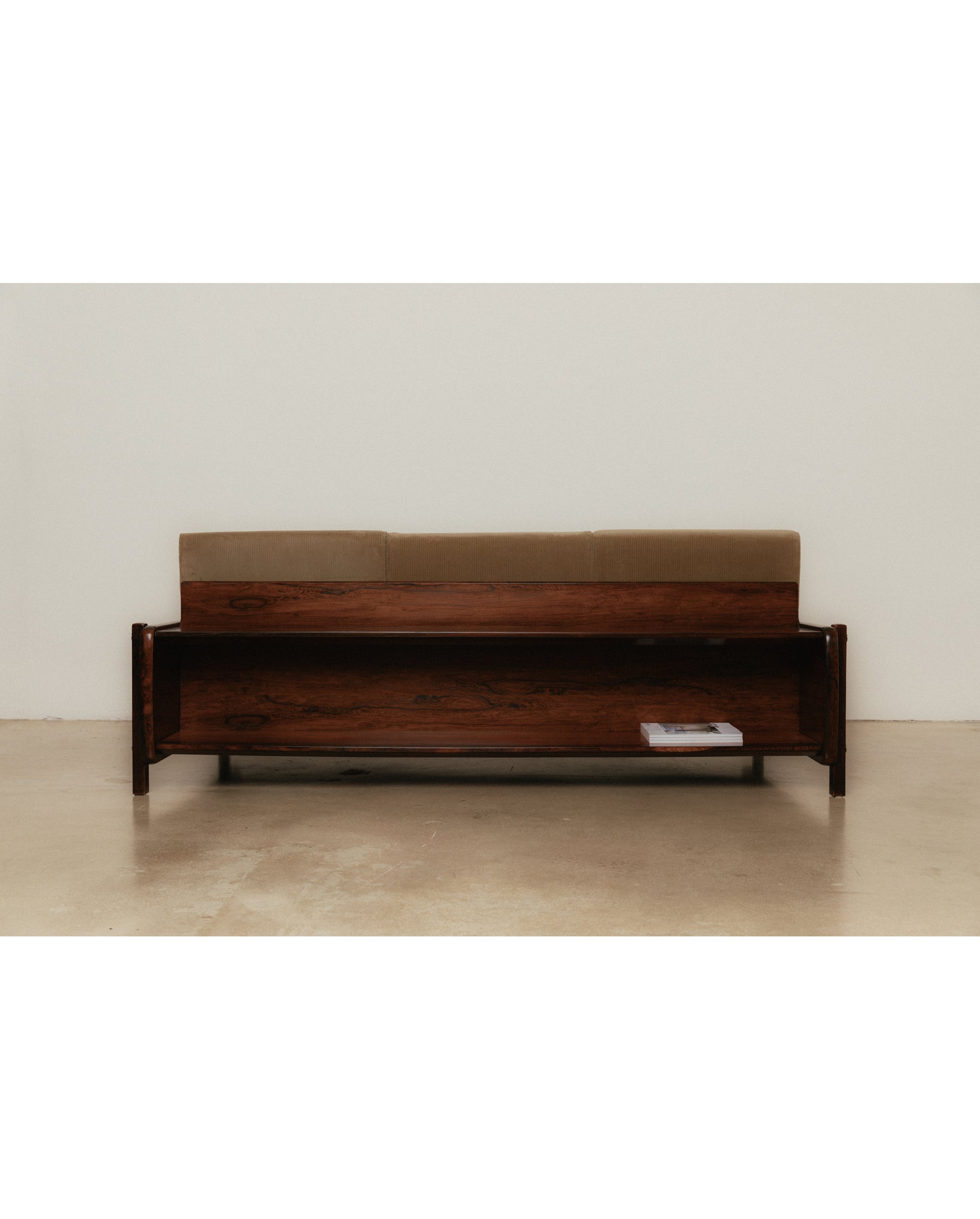 The Macedo sofa embodies Brazilian modernity with its solid wood structure, wide pillows and also double-functioning as a bookshelf.