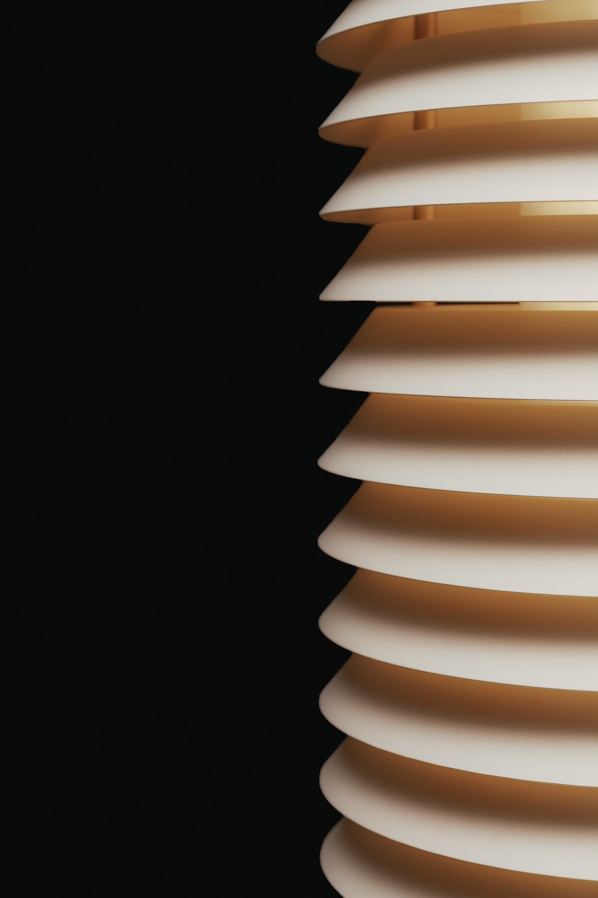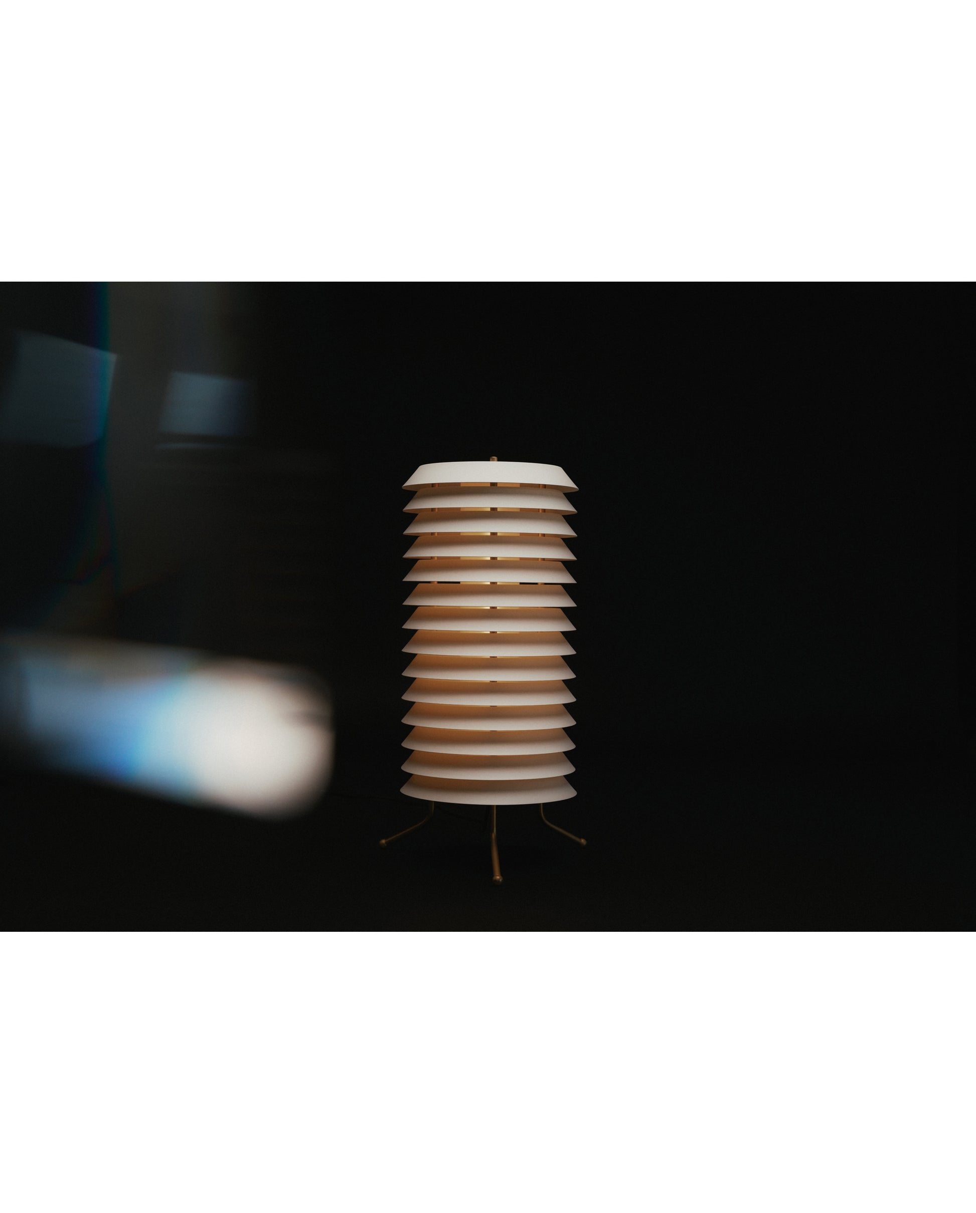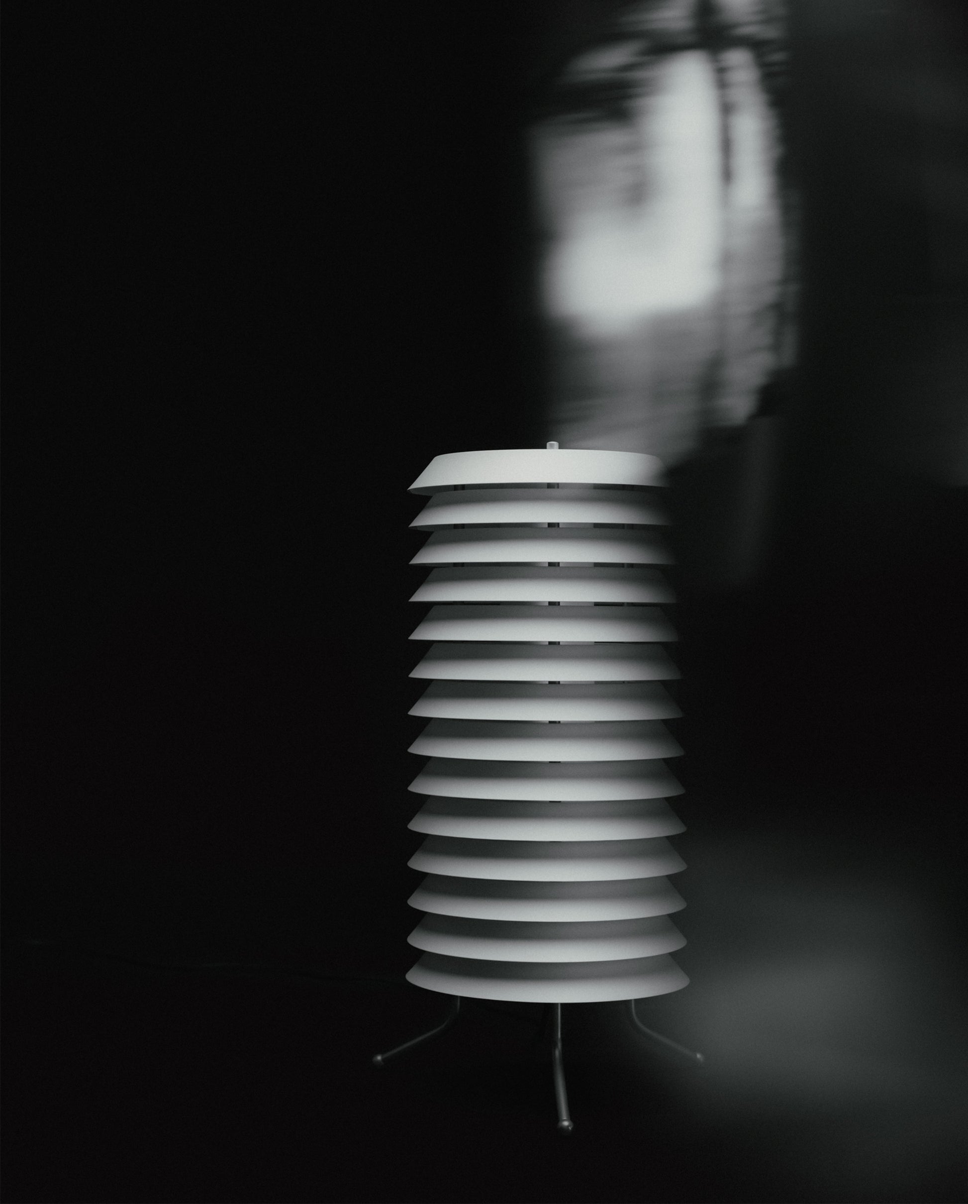 The Maija floor lamp reminds us of light that sieves through window blinds of homes at night. Inviting yet enigmatic, this lamp is a tower composed of stacked metal discs.