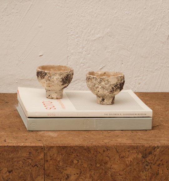 Hand-formed ceramic cups by Turbina, characterized by their raw, mineral surface and irregular texture. Each piece carries visible traces of the firing process, resulting in subtle variations in tone and form. Designed as intimate objects, they sit somewhere between utility and sculpture, emphasizing tactility, weight, and material presence.