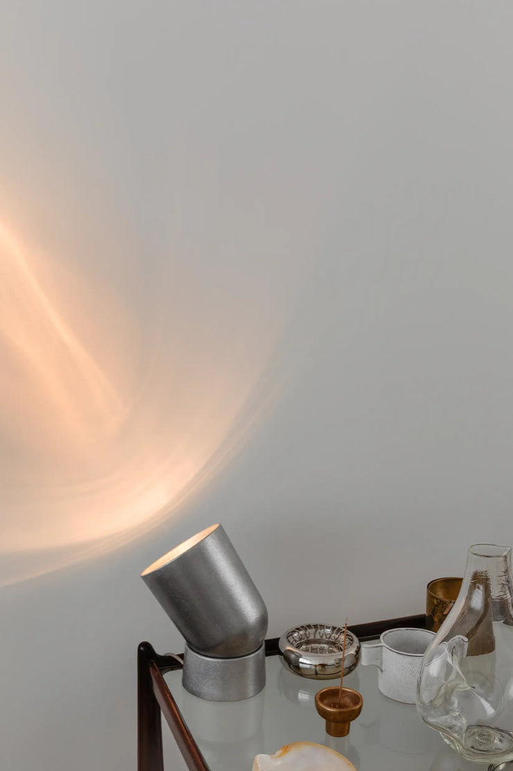Streamlining and adapting a form customarily employed at performance venues, the Spot Light is a sculptural lamp of two parts, featuring an articulated, semi-cylindrical inverted shade set in a sturdy circular base.