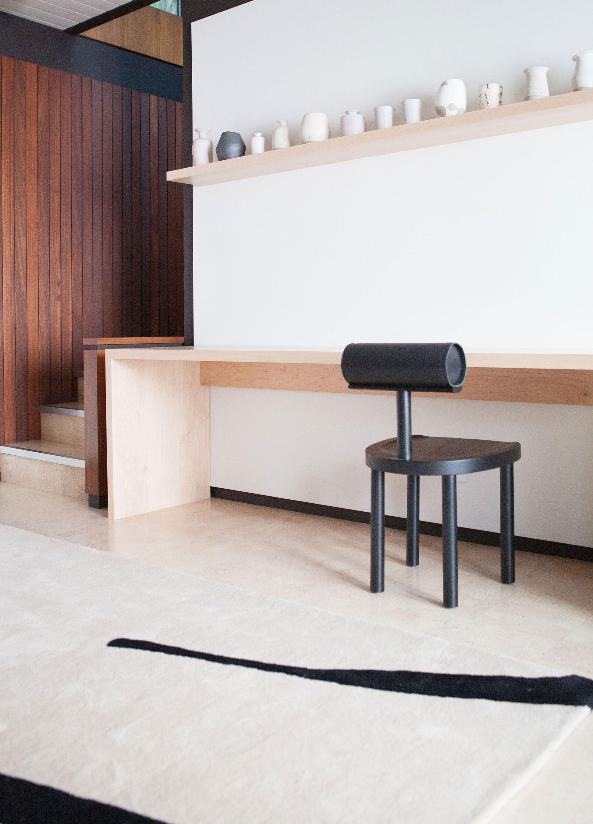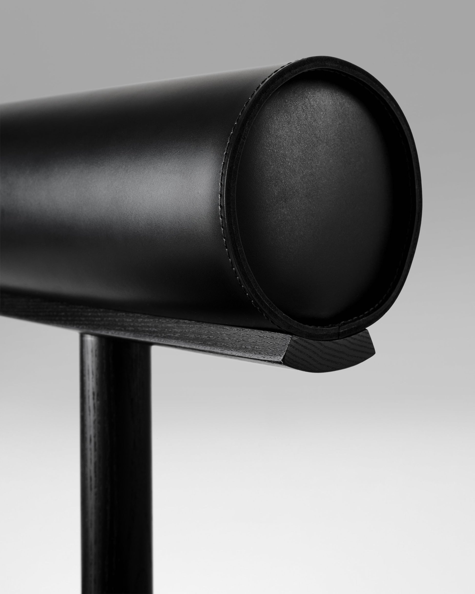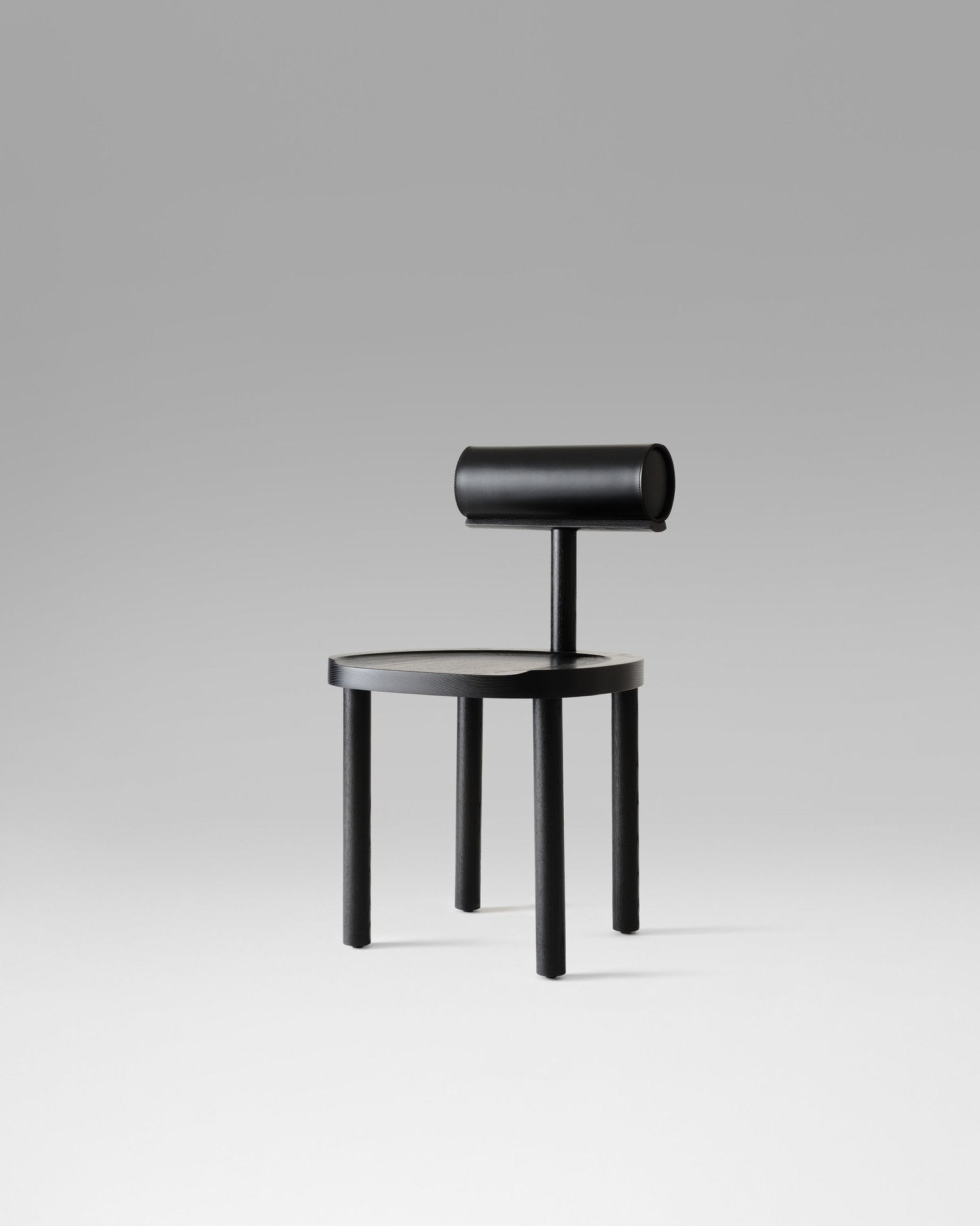 The UNA chair combines a curved wooden seat and legs with a leather-upholstered, cylindrical backrest, showcasing natural wood grain and expert leather craftsmanship for a blend of comfort and simplicity.